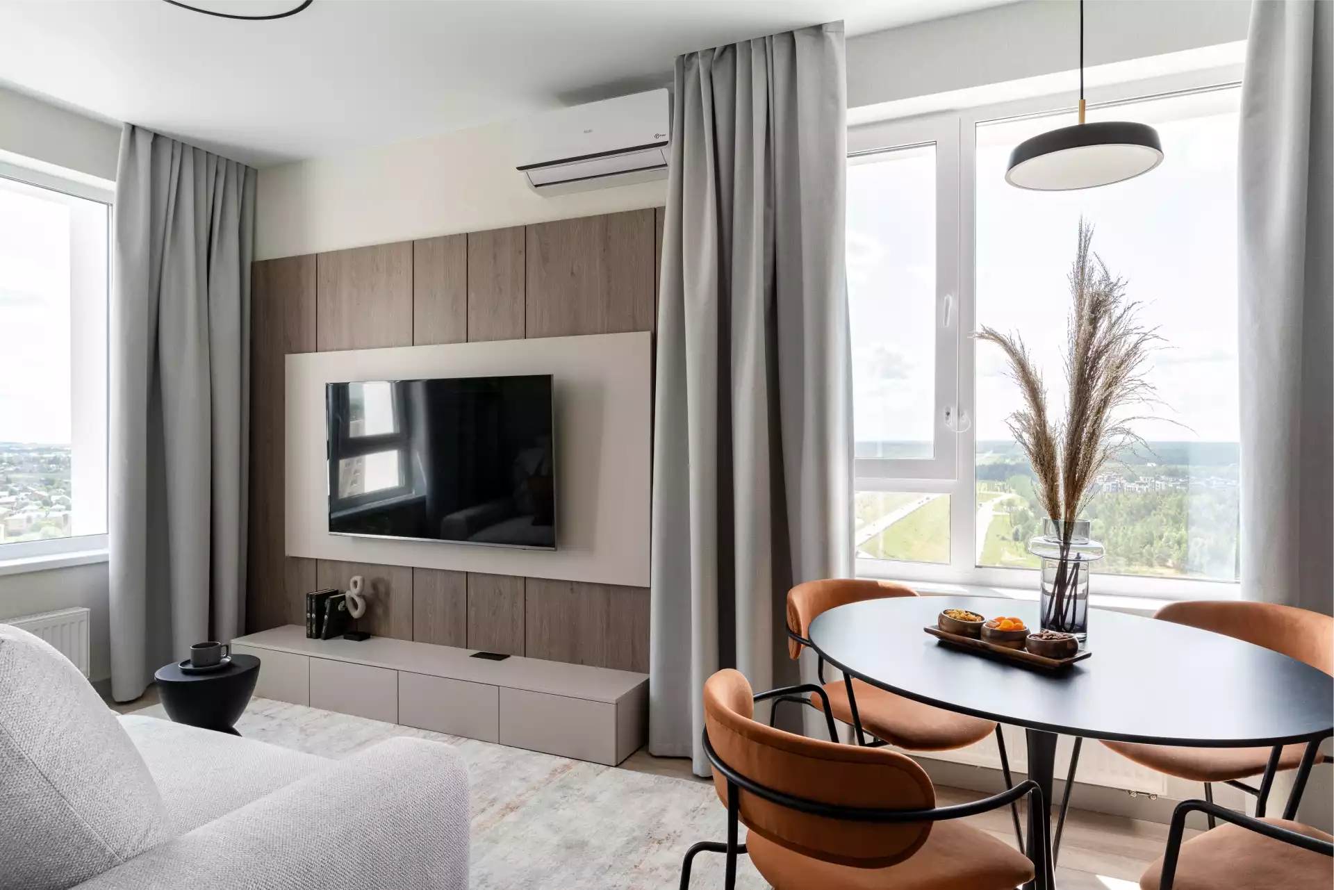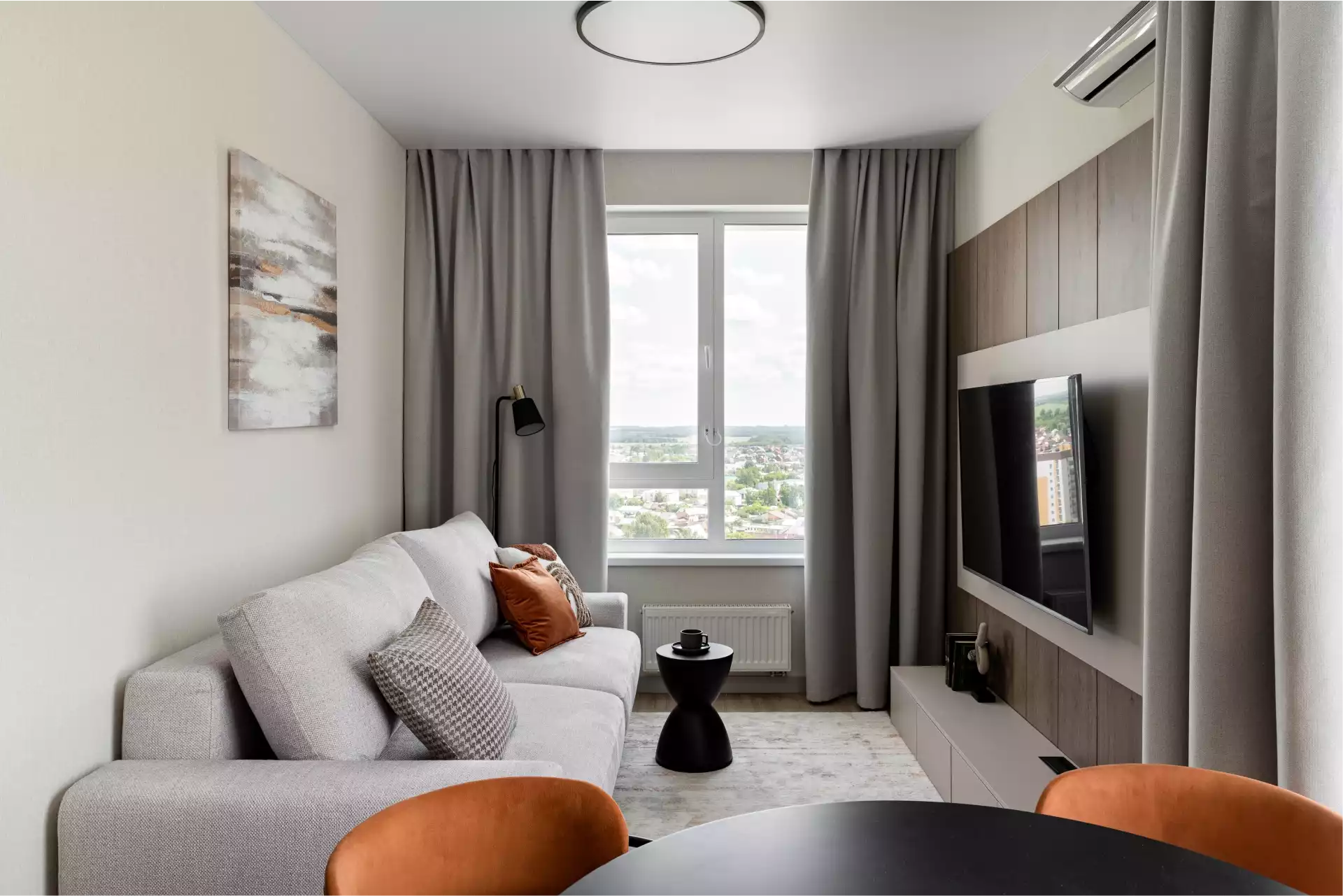 Диван, журнальный столик и ТВ-зона создают пространство для встреч и отдыха, где комфорт ощущается в каждой детали -
