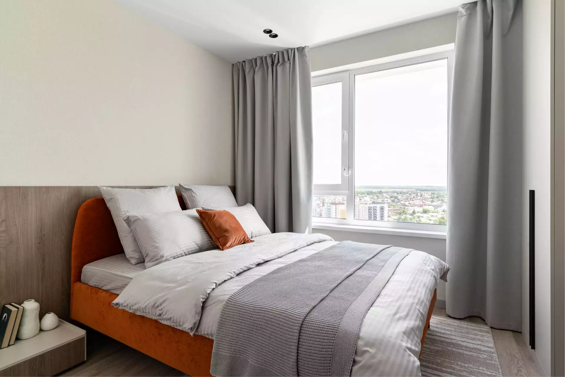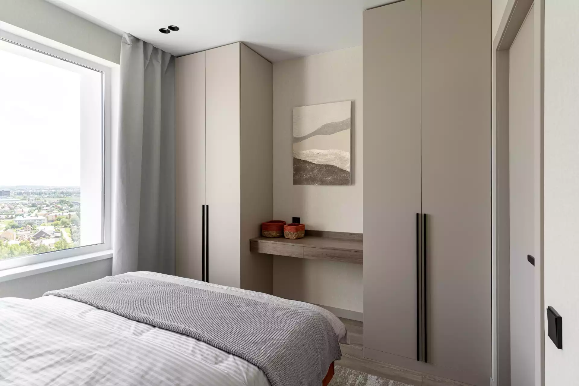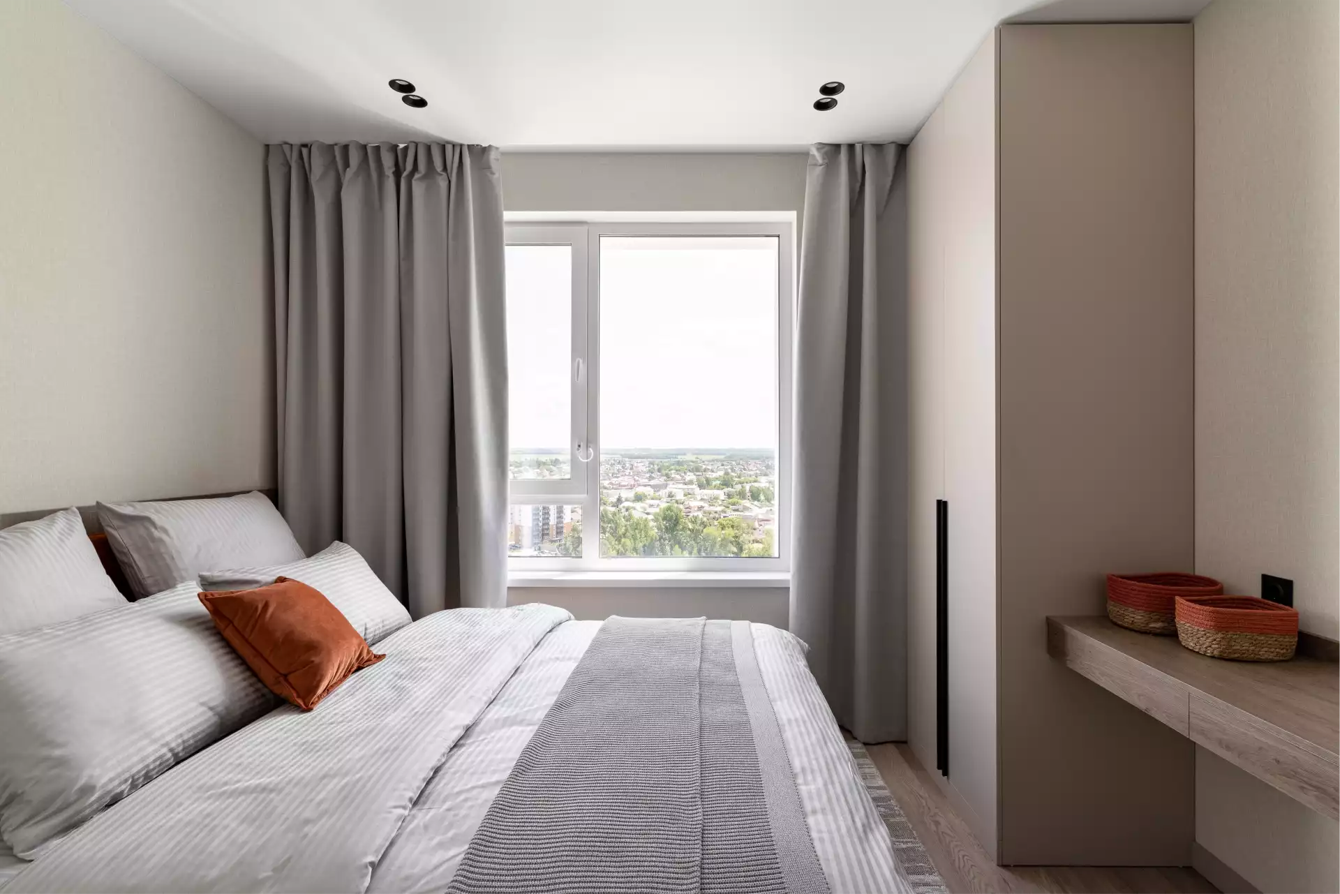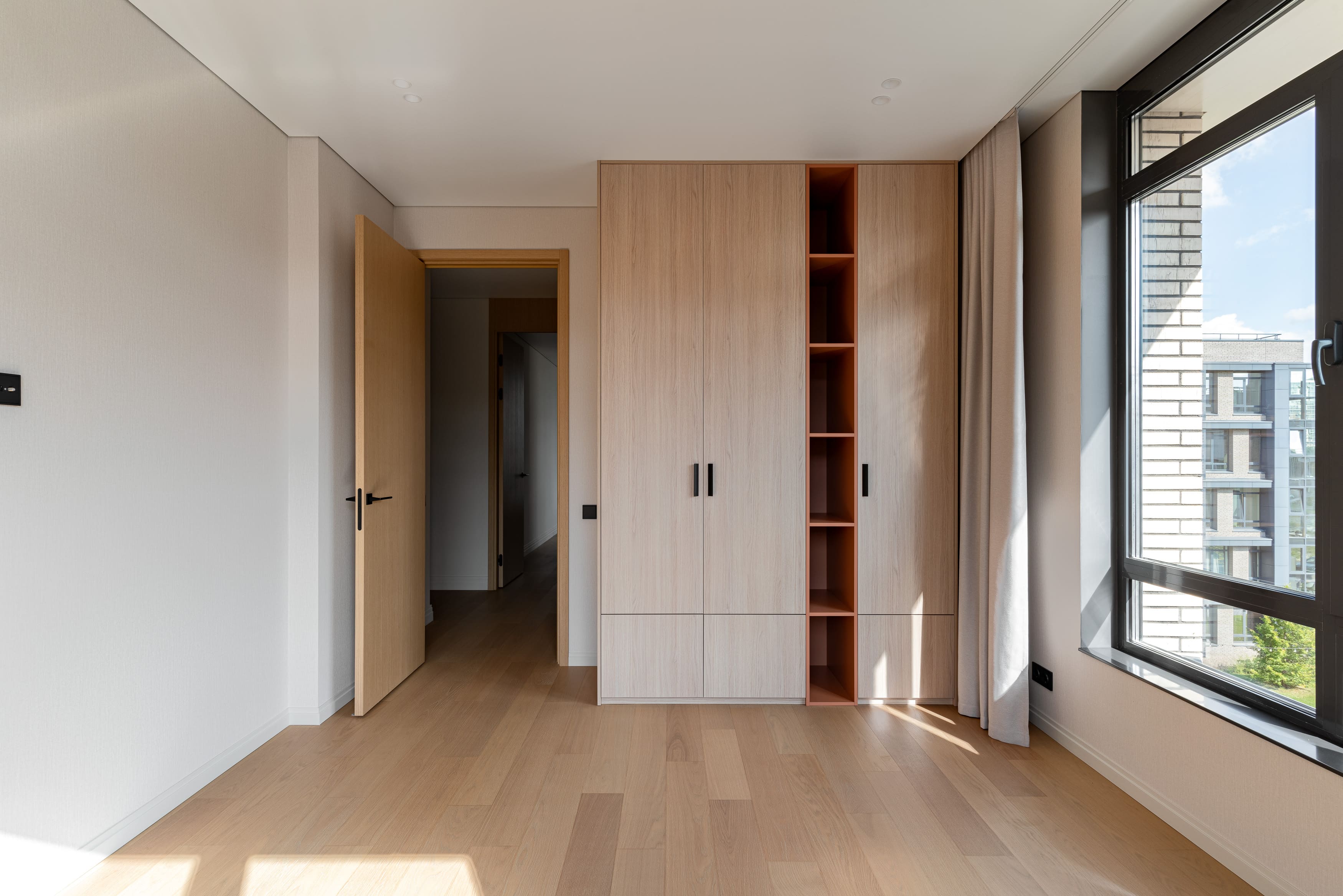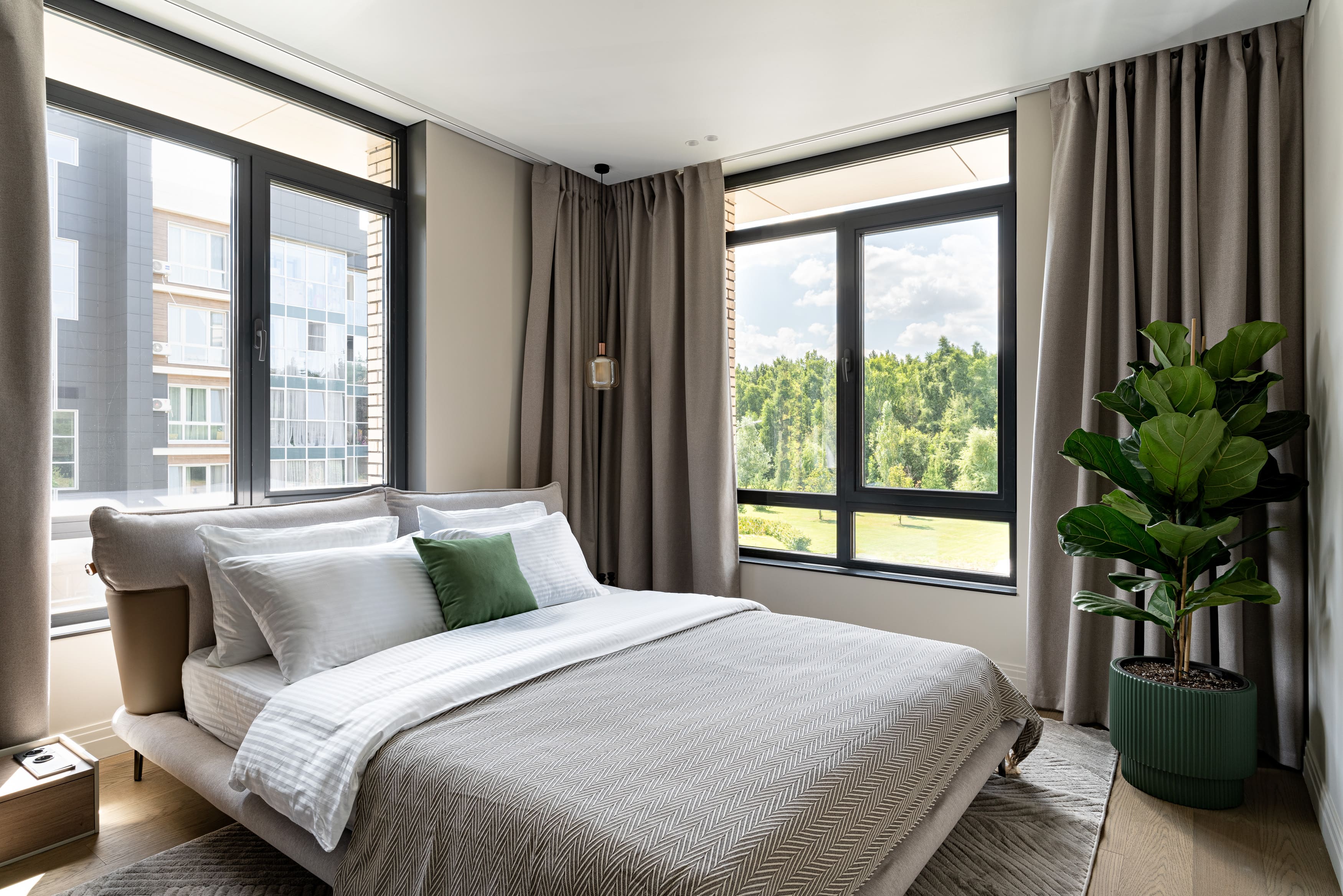 Двуспальная кровать, гардеробная и туалетный столик формируют атмосферу личного уюта. Blackout-шторы создают идеальные условия для сна - Квартиры полностью меблированы и укомплектованы текстилем: ковры, постельное бельё, подушки и одеяла. Вам остаётся только въехать и наслаждаться высоким уровнем комфорта