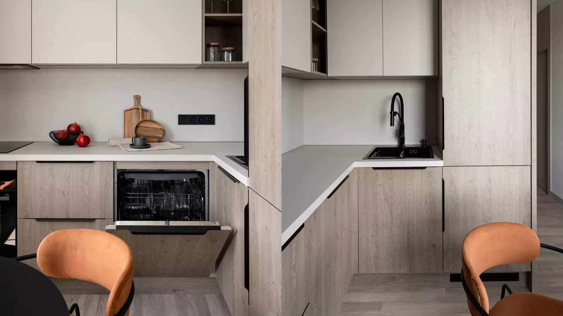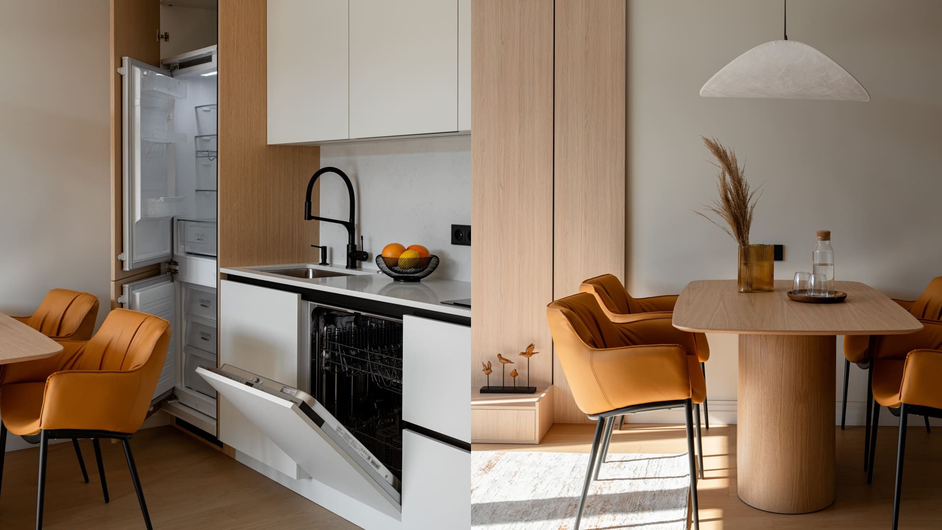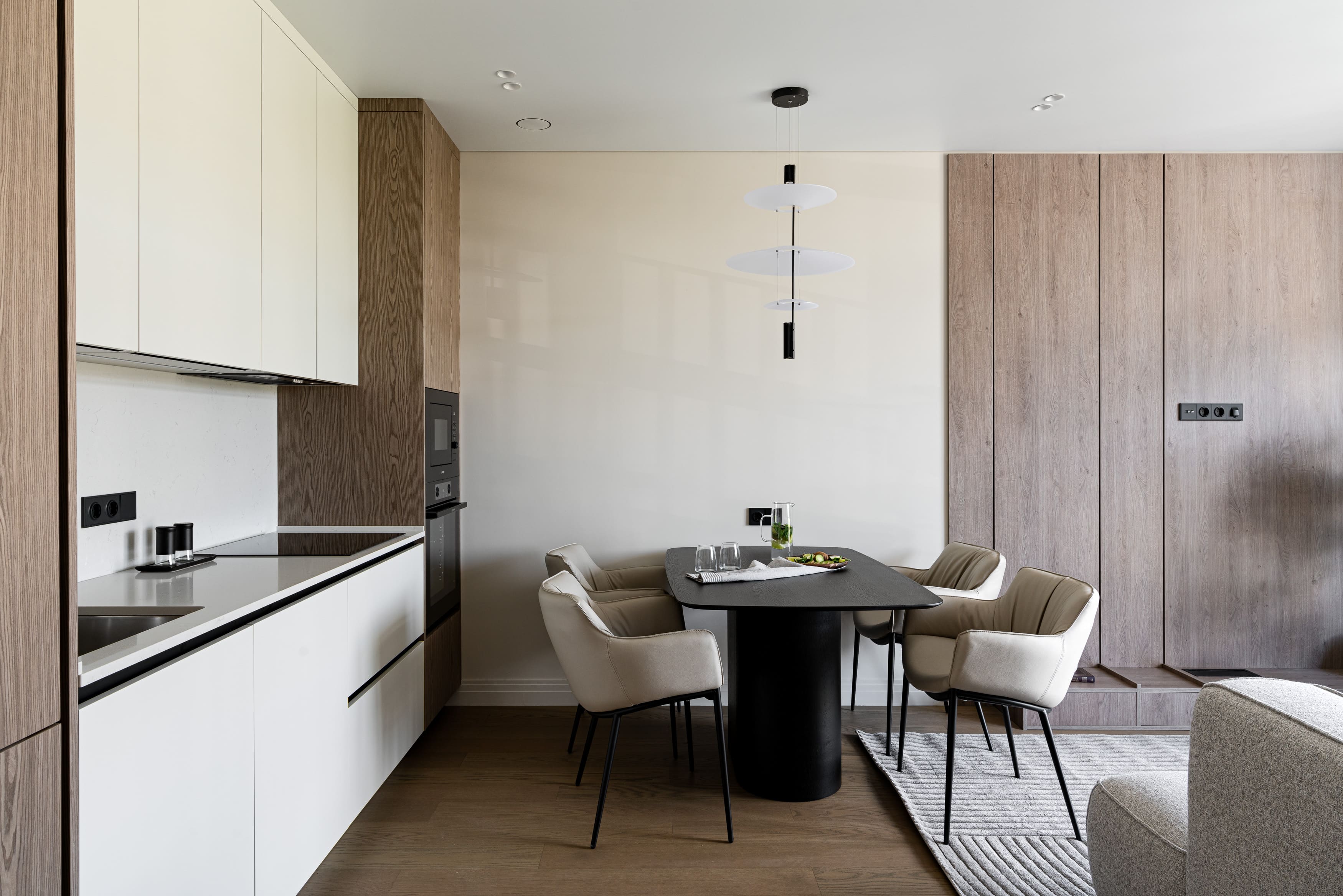 Встроенная техника Gorenje и Hisense органично вписывается в лаконичный гарнитур с мягкой подсветкой. Обеденная зона превращает ежедневные приёмы пищи в моменты спокойствия и удовольствия -